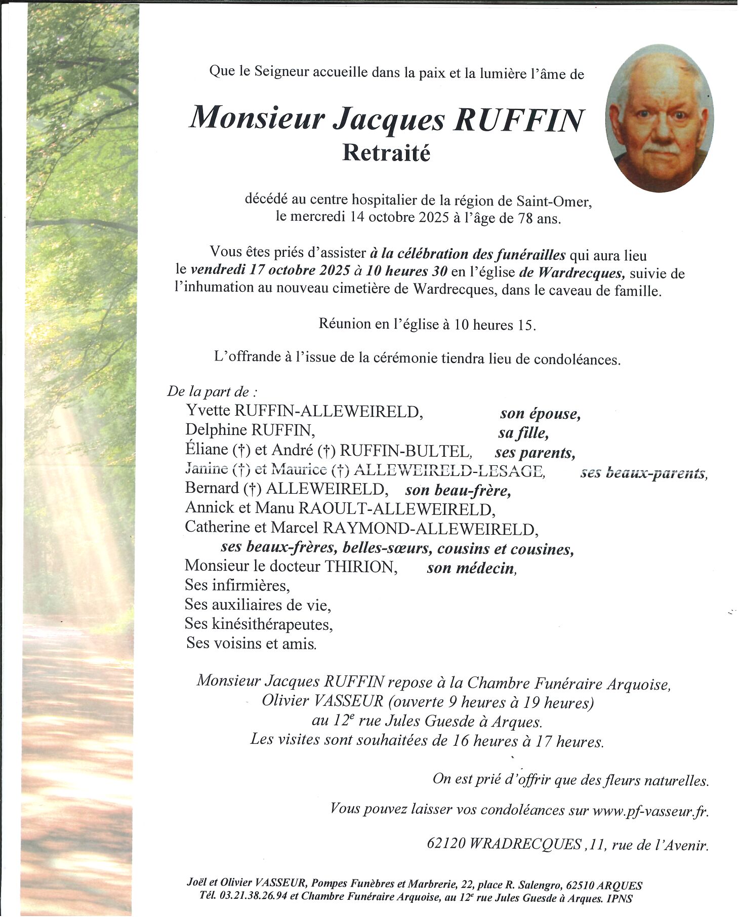 Mr Jacques RUFFIN Décédé le 14/10/2025 Laissez un message de condoléances